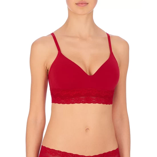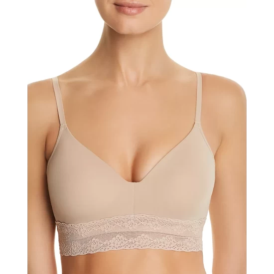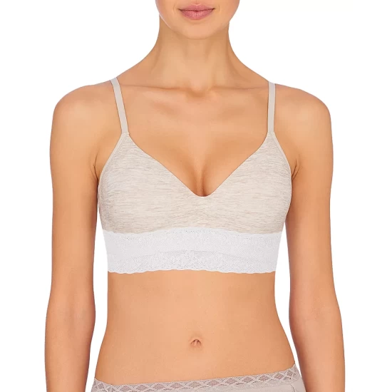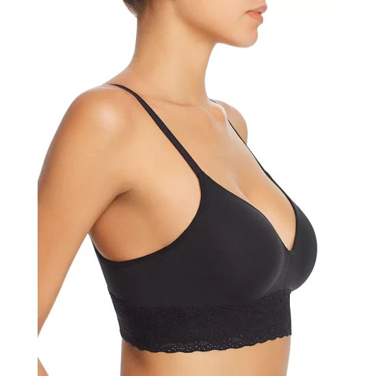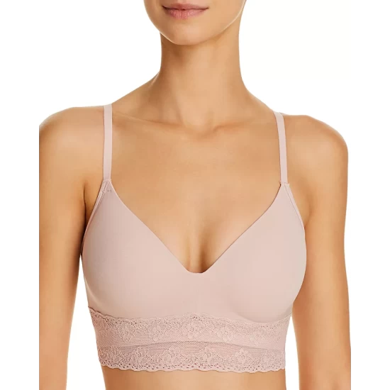 - Soft foam wireless cups with brushed inner lining, sheer lace trim