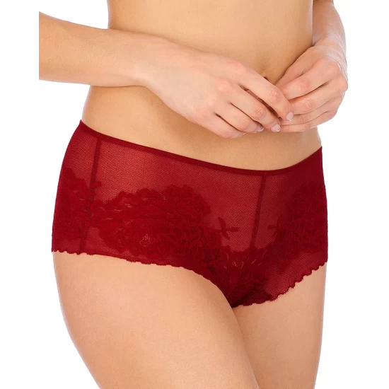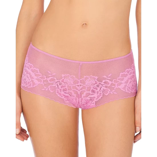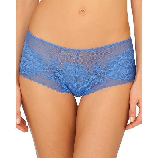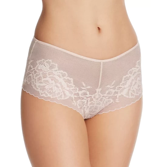 - Elasticized waistband, sheer mesh and lace body, lined gusset