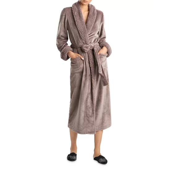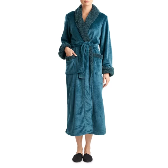 - Shawl collar, long sleeves, front patch pockets, fuzzy trim