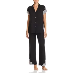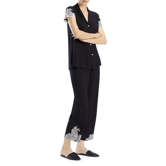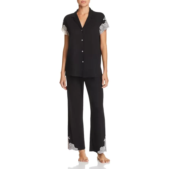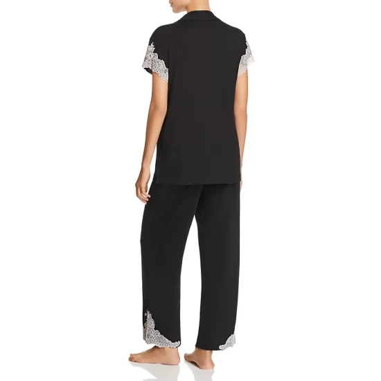 - Pants: elasticized drawstring waistband, lace trim at cuffs, cropped