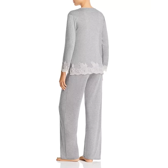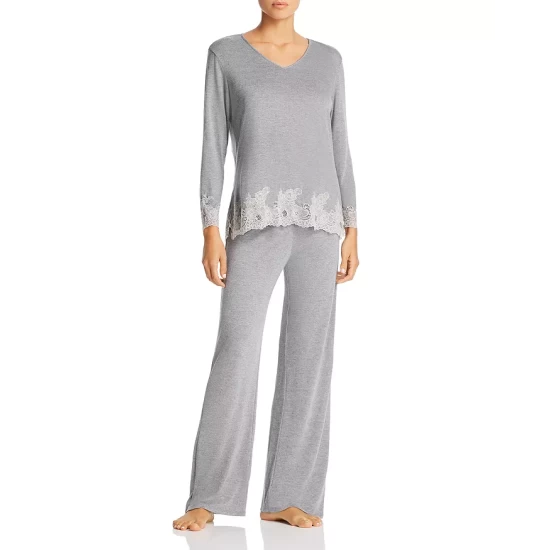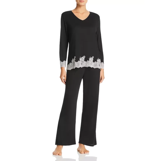- Top: V-neck, lace trim at long-sleeve cuffs and hem