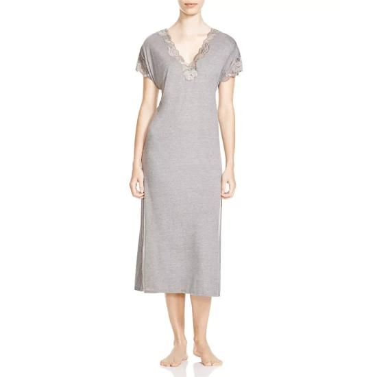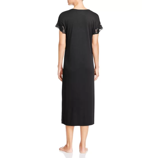 - V-neck, cap sleeves, scalloped floral lace trim, knit body